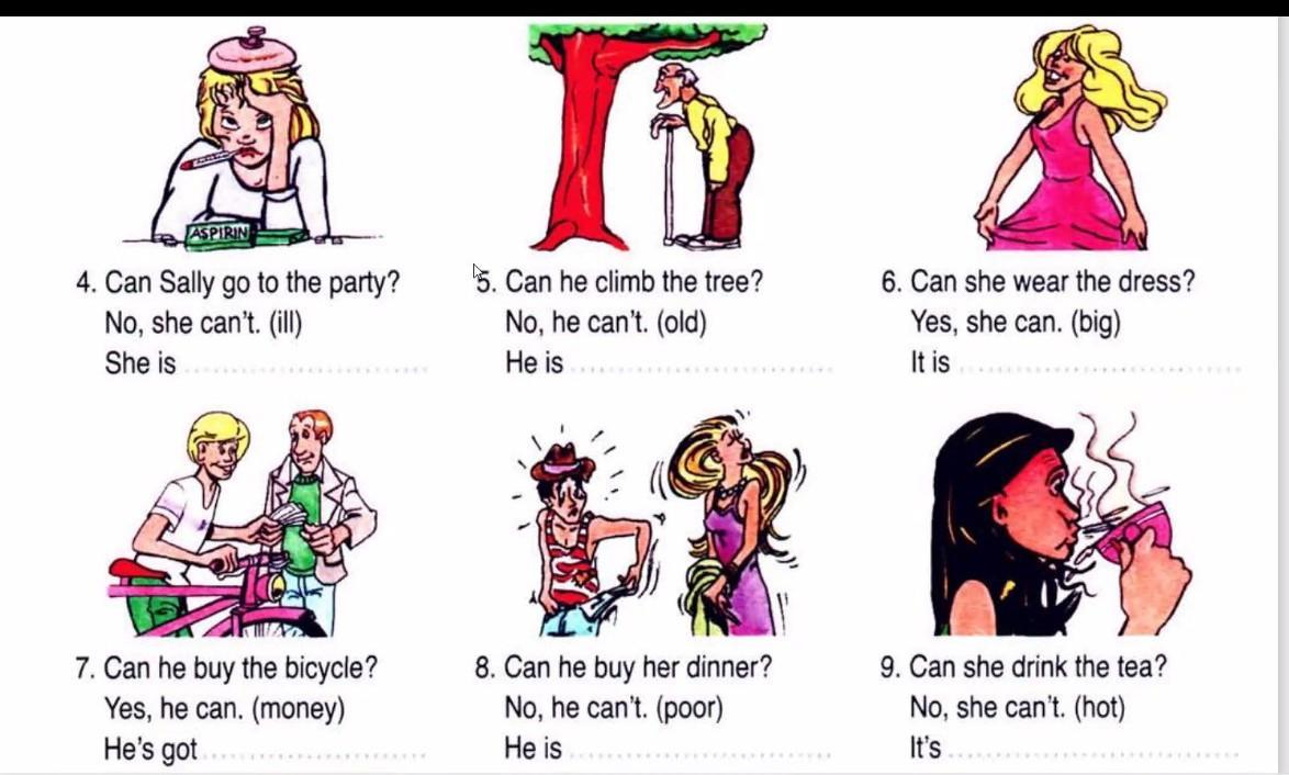 4. Can Sally go to the party? No, she can't. (ill) She is 7. Can he buy the bicycle? Yes, he can. (money) He's got fo 5. Can he climb the tree? No, he can't. (old) He is bi 8. Can he buy her dinner? No, he can't. (poor) He is 6. Can she wear the dress? Yes, she can. (big) It is 9. Can she drink the tea? No, she can't. (hot) It's