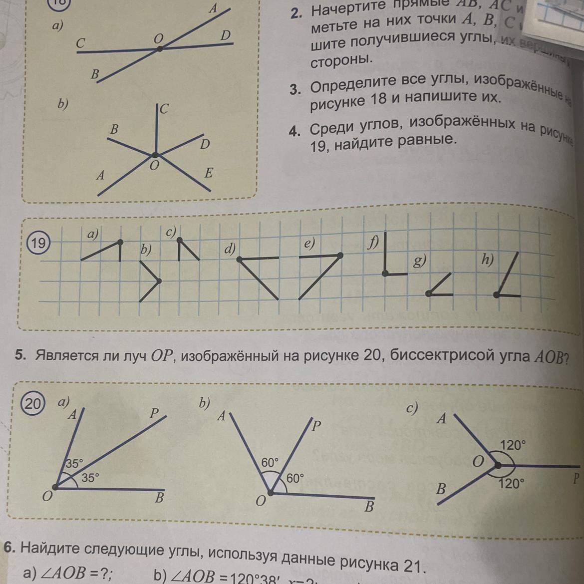 5. Является ли луч ОР, изображённый на рисунке 20, биссектрисой угла АОВ?
