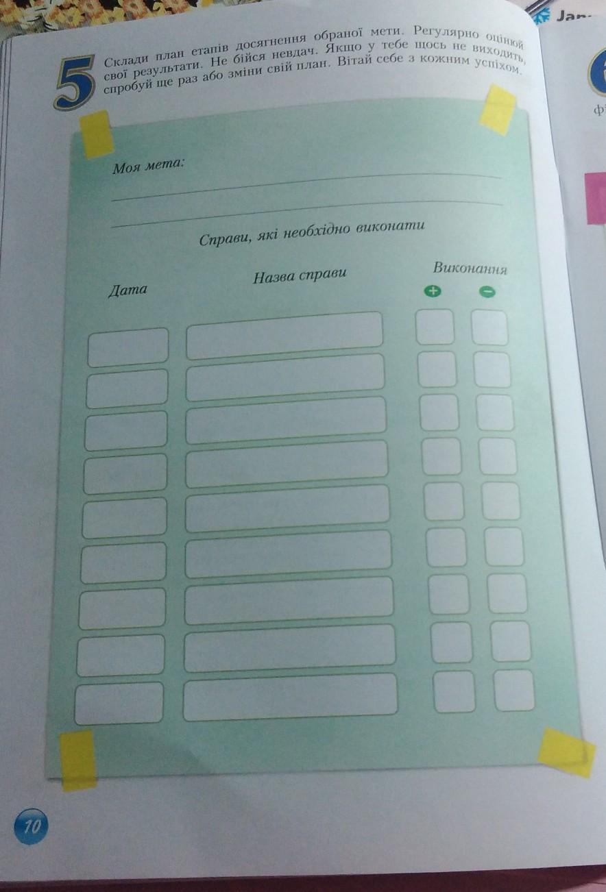 своï результати. Невдач. Якщо у тебе щось не виходить, Склади план етапів досягнення обраної мети. Регулярно оцінюй спробуй ще раз або зміни свій план. Вітай себе з кожним успіхом. Моя мета: