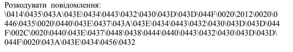 Розкодувати повідомлення: \0414\0435\043A\043E\0434\0443\0432\0430\043D\043D\044F\0020\2012\0020\0 446\0435\0020\0440\043E\0437\043A\043E\0434\0443\0432\0430\043D\043D\044 F\002C\0020\0440\043E\0437\0448\0438\0444\0440\0443\0432\0430\043D\043D\ 044F\0020\043A\043E\0434\0456\0432