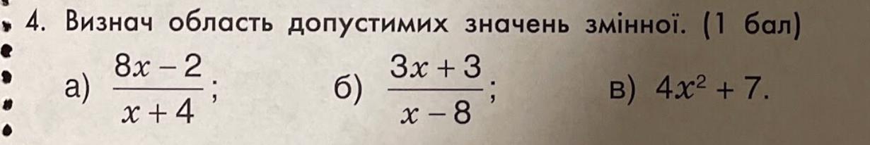 Визнач область допустимих значень змінної а) 8х-2/х+4 б)3х+3/х-8 в)4х2+7