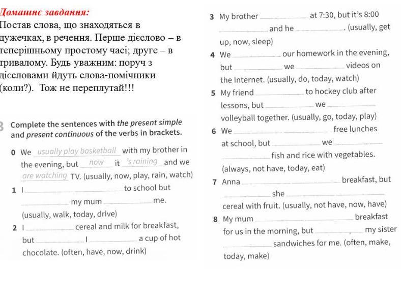 1.I usually walk to school but today my mum drive me 2.I often have cereal and milk for breakfast, but now I drink a cup of hot3.My brother get up at 7:30,but it’s 8:00 now and he usually sleep4.We usually do our homework in the evening, but today we watch videos on the Internet.5.My friend today go to hockey club after lessons,but usually we play volleyball together 6.We always doesn’t have free lunches at school,but today we eat fish and rice with vegetables 7.Anna usually doesn’t have breakfast,but now she have cereal with fruit 8.My mum often make breakfast for us in the morning,but today my sister make sandwich for me