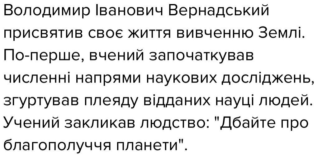 (1) Володимир Іванович Вернадський присвятив своє життя вивченню Землі. (2) По-перше він був ініціатором
