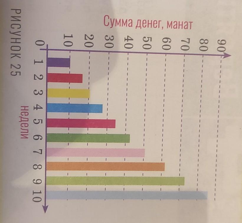 5. Экономика: Часть карманных денег за неделю Ахмед откладывает и хочет купить на собранные деньги ве- лосипед. Изначально у него было 10 манат. Первую не- делю он добавил к этим деньгам З маната, вторую не- 4 маната, 3-ю - 5 манат и так далее. В течение - делю 10 недель каждую неделю он увеличивал собирае мую сумму денег. Происходящее изображено с помощью столбчатой диаграммы (рисунок 25).