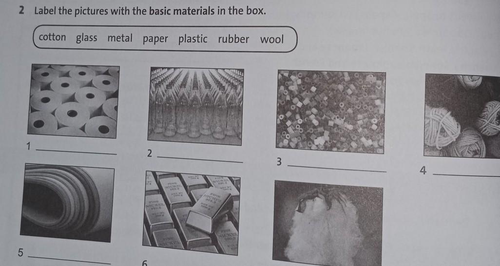 2 Label the pictures with the basic materials in the box. cotton glass metal paper plastic rubber wool 5 1 2 TINK NICKEL 6 NICK N NICHEE HAY HE YEAR NICKYA Complete the sentences with the raw matouil 3 7 4