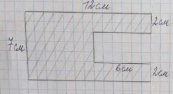 1) по сути эта фигура это большой прямоугольник(12см на 7см) из которого вырезали маленький прямоугольник (6см на 3см) то есть чтобы найти площадь этой фигуры нам надо из площади большого прямоугольника отнять площадь маленького прямоугольника. 2)площадь считается по формуле S пр = a ⋅ b .