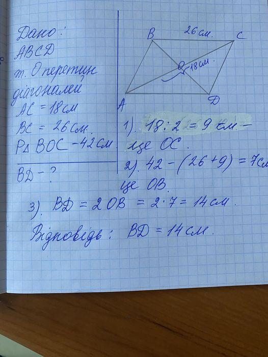 Точка О - точка перетину діагоналей АС і BD паралелограма ABCD. Знайдіть довжину діагоналі BD, якщо АС= 18 см, ВС=26 см, а периметр трикутника ВОС дорівнює 42 см.