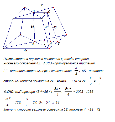 в правильной четырехугольной усеченной пирамиде высота равна 36 см,апофема равна 45 см,а стороны основания относятся как 1:4,найти эти стороны