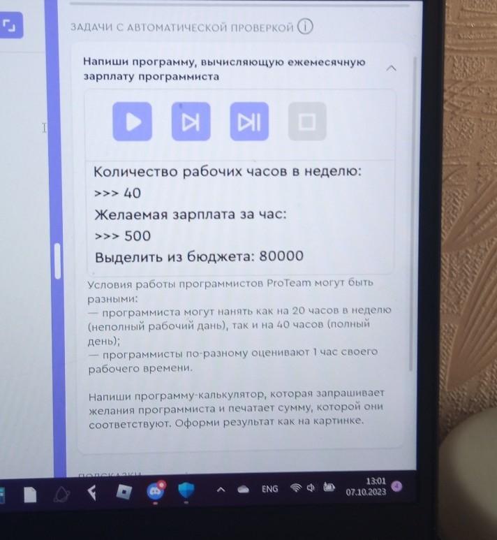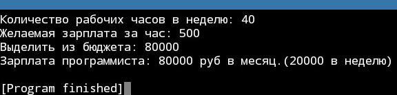 print(f"Зарплата программиста: {result*4} руб в месяц.({result} в неделю)")