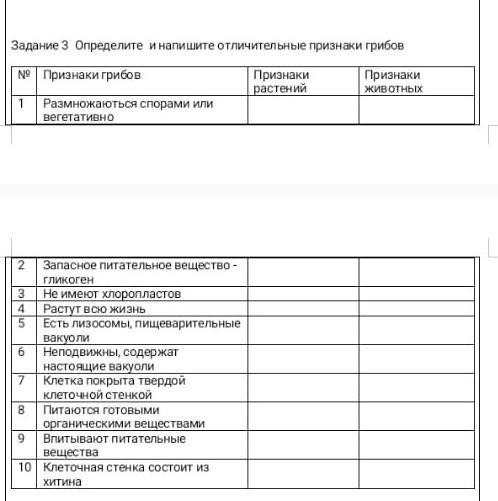 Задание 3 Определите и напишите отличительные признаки грибов № Признаки грибов Признаки животных 1 Размножаються спорами или вегетативно 2 3 4 5 6 Неподвижны, содержат настоящие вакуоли Клетка покрыта твердой клеточной стенкой Питаются готовыми органическими веществами Впитывают питательные вещества 10 | Клеточная стенка состоит из хитина 7 8 Запасное питательное вещество - гликоген Не имеют хлоропластов Растут всю жизнь Есть лизосомы, пищеварительные вакуоли 9 Признаки растений.Помогите пожалуйста!!!