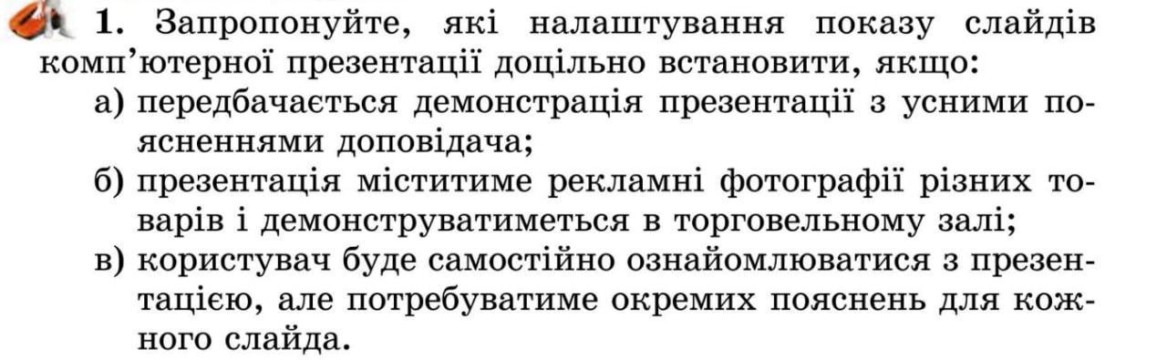 а) Для варіанту, де передбачається демонстрація презентації з усними поясненнями доповідача, доцільно встановити наступні налаштування:
