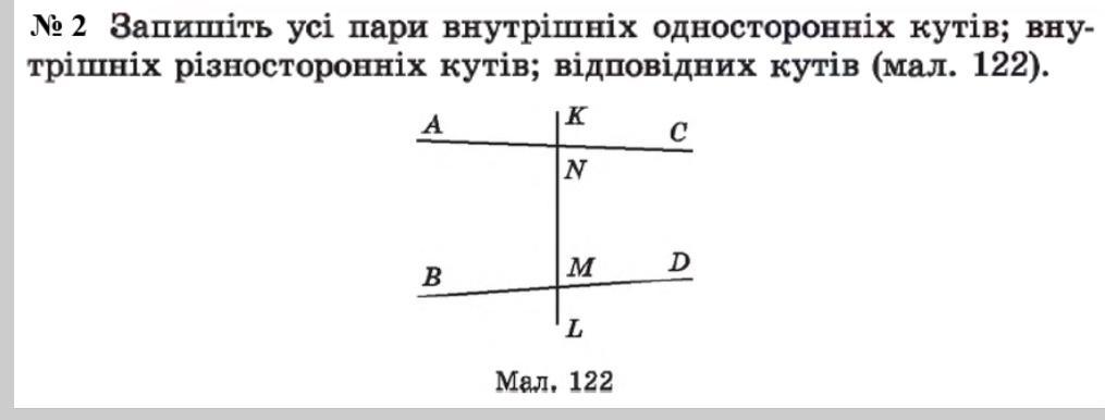 Запишіть усі пари внутрішніх односторонніх кутів; вну- трішніх різносторонніх кутів; відповідних кутів (мал. 122