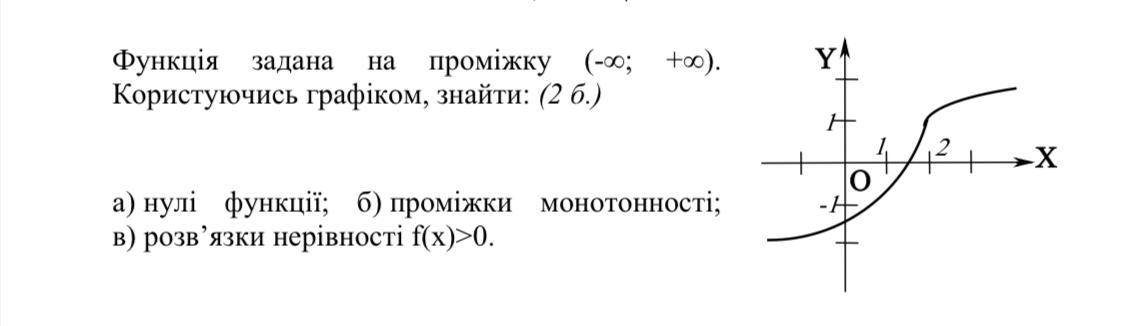 Фото для пояснення, нулі функції знайдені за графіком, монотонність це проміжки де функція зростає або спадає. В данному випадку функція взагалі не спадає. Що до нерівності, ми знаходимо на графіку точку де у=0, х =1,5. За нерівністю у>0, тому х ≠1,5, відповідно область визначення (1,5;+∞).