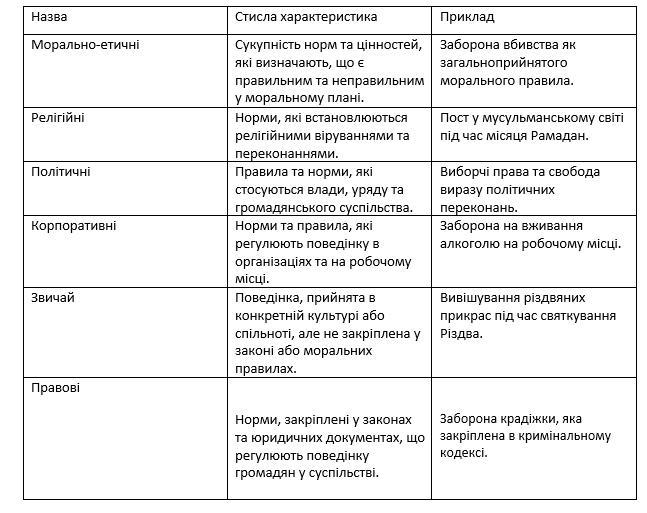 Охарактеризуйте види соціальних норм та заповніть табличку