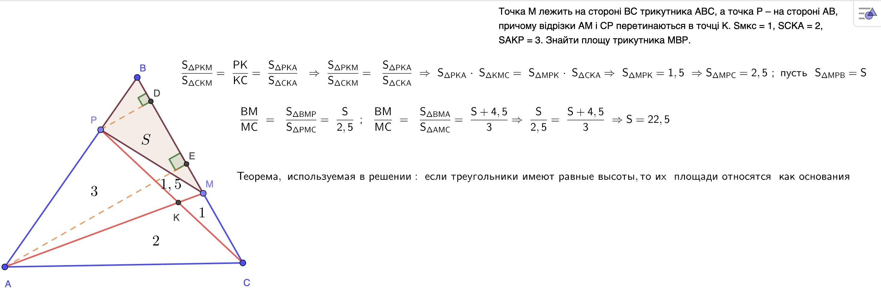 6. Точка М лежить на стороні ВС трикутника ABC, а точка P – на стороні AB, причому відрізки АМ і СР перетинаються в точці К. Sмкс = 1, SCKA = 2, SAKP = 3. Знайти площу трикутника МВР.