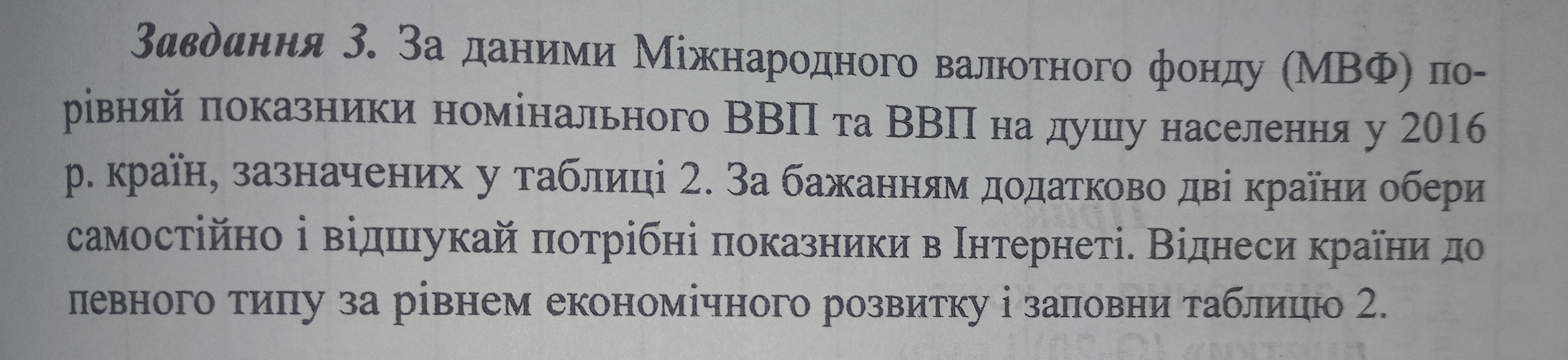 На жаль, я не можу провести пошук в Інтернеті, оскільки це текстовий інтерфейс. Тому я не можу заповнити для вас таблицю 2 з даними про показники номінального ВВП та ВВП на душу населення у 2016 році для різних країн. Я можу надати лише загальну інформацію про типи економічного розвитку країн.