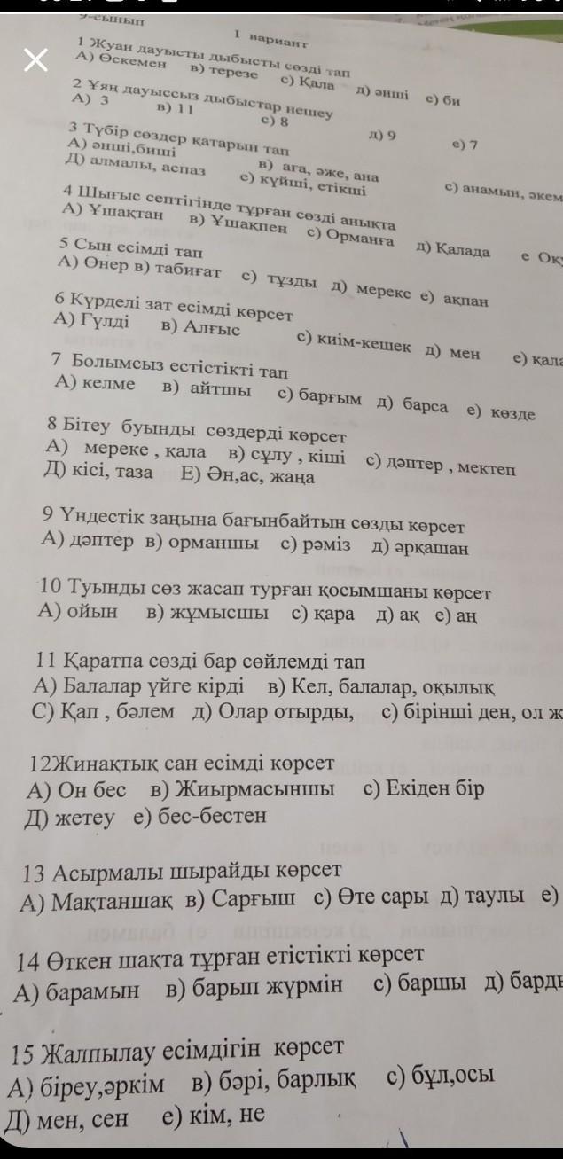 X Жуан дауысты дыбысты сезді тап А) Өскемен в) терезе c) Кала 2 Ұян дауыссыз дыбыстар нешеу A) 3 B) 11 c) 8 париант 3 Түбір сөздер катарын тап А) әнші,бишi Д) алмалы, аспаз 5 Сын есімді тап А) Өнер в) табиғат B) ага, әже, ана e) күйші, етікші 4 Шығыс септігінде тұрған сөзді анықта А) Ұшақтан в) Ұшақпен с) Орманға А) мереке, қала Д) кiсi, таза д) әншi 6 Күрделі зат есімді көрсет А) Гүлді в) Алғыс д) 9 8 Бітеу буынды сөздерді көрсет в) сұлу, кіші Е) Ән,ас, жаңа е) би c) 7 с) тұзды д) мереке е) акпан с) анамын, әкем, д) Калада с) киiм-кешек д) мен 12Жинактык сан есiмдi көрсет А) Он бес в) Жиырмасыншы Д) жетеу е) бес-бестен 7 Болымсыз естiстiктi тап А) келме в) айтшы с) баргым д) барса е) кезде 9 Үндестік заңына бағынбайтын сезды көрсет А) дәптер в) орманшы с) рәміз д) әрқашан с) дәптер, мектеп 10 Туынды сөз жасап турған қосымшаны көрсет А) ойын в) жұмысшы с) кара д) ак е) ан е Окушыме 11 Қаратпа сөзді бар сөйлемді тап А) Балалар үйге кiрдi в) Кел, балалар, оқылық C) Кап, бәлем д) Олар отырды, с) бiрiншi ден, ол жакы c) Екiден бiр е) кала 13 Асырмалы шырайды көрсет А) Мақтаншақ в) Сарғыш с) Өте сары д) таулы е) қызы 15 Жалпылау есімдігін көрсет А) біреу,әркім в) бәрі, барлық с) бұл,осы Д) мен, сен е) кім, не 14 Өткен шақта тұрған етістікті көрсет А) барамын в) барып жүрмін с) баршы д) барды е