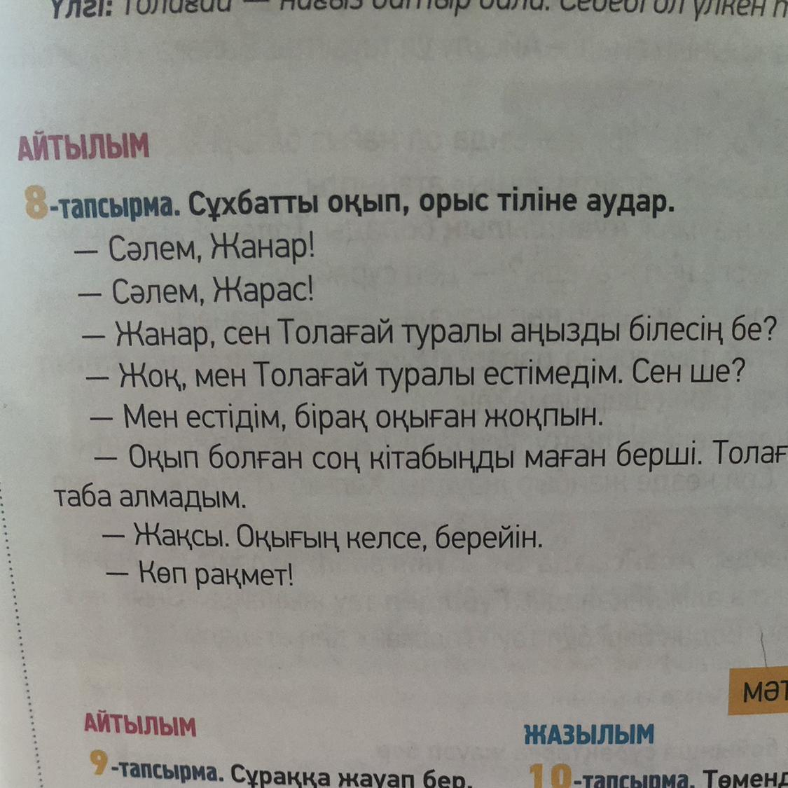 8-тапсырма. Сұхбатты окып, орыс тіліне аудар.