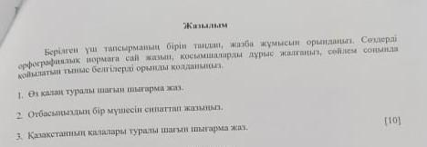 Жазылым Берілген уш тапсырманы бiрiн тандап, жоба жумысын орындалып. Сездерді орфографиялык нормага сай жазып, косымшаларды дурыс жалгашып, сойлем сонында койылатын тыпас белгiлердi орынды колданы 1. Өкан Турыгарма жа 2 Отбасыныздын бiр мүшесiн си 3. Казакстаннын калалары туралы шагын шыгарма жаз [10]
