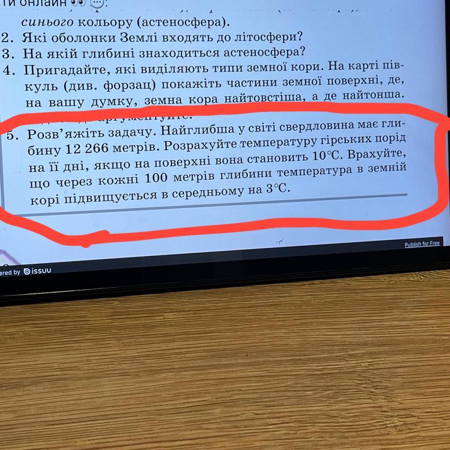 Хелп ми плис. Розвʼяжіть задачу. Найглибша у світі свердловина має глибину 12 266 метрів. Розрахуйте температуру гірських порід на її дні, якщо на поверхні вона становить 10°С. Врахуйте, що через кожні 100 метрів глибини температура в земній корі підвищується в середньому на 3°С.