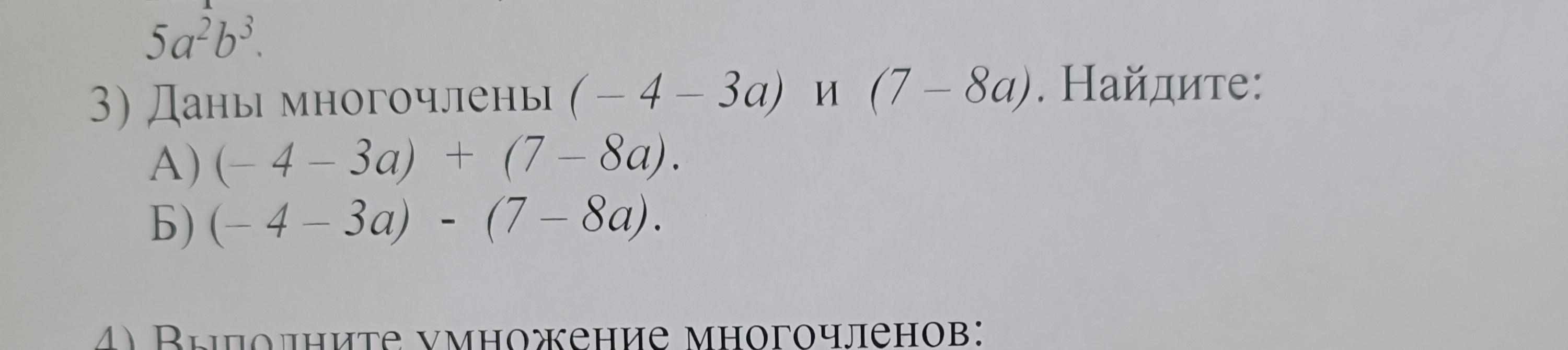 Даны многочлены (-4-3а) и (7-8а). Найдите: