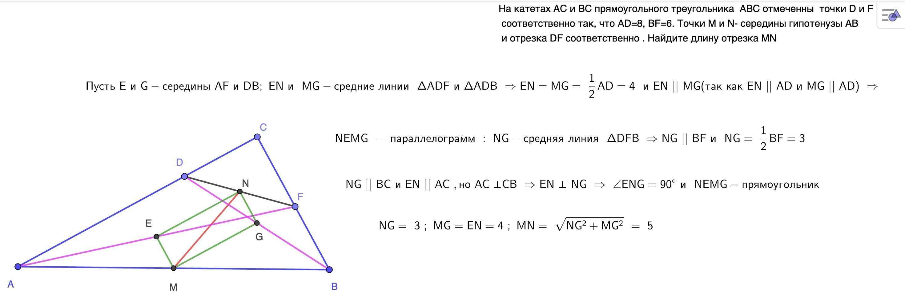 На катетах AC и BC прямоугольного треугольника ABC отмеченны точки D и F соответственно так, что AD=8, BF=6. Точки M и N- середины гипотенузы AB и отрезка DF соответственно . Найдите длину отрезка MN