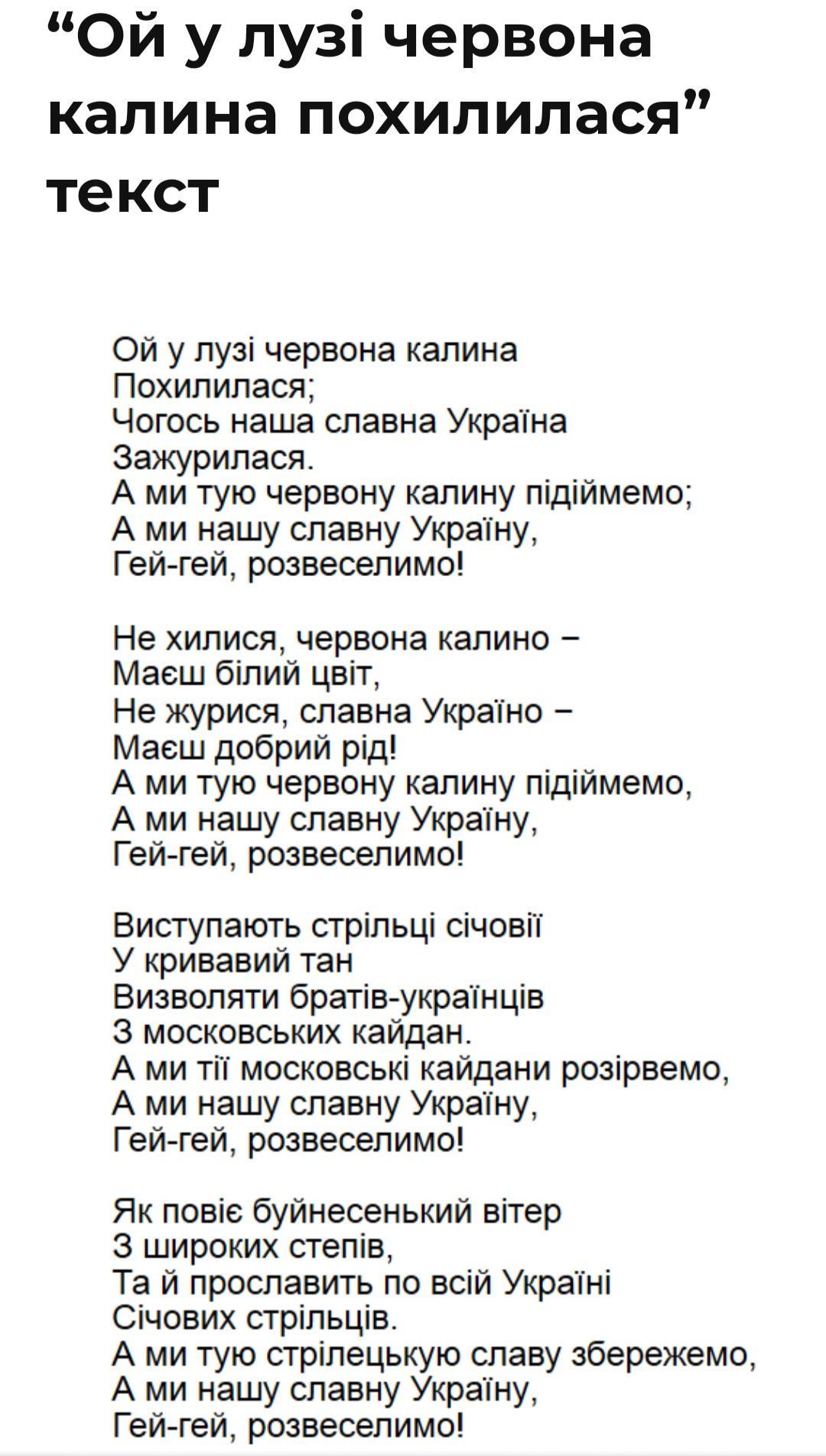 Пісня "Ой у лузі червона калина" виникла у період зародження січового стрілецького руху і зразу набула широко розголосу, а для січових стрільців стала своєрідним гімном. Ця пісня сповнена щемливої любові до рідної Вітчизни, пройнята духом нескореності нашого народу. Вона уславлює січових стрільців, які вели збройну боротьбу проти царських та польських військ. І слова, і мелодія пісні наскрізь народні. В уяві українців червона калина була символом рідного краю і дівочої вірності та краси. Найбільшу ідейно-художню енергію випромінюють слова, запозичені з історичного першоджерела: