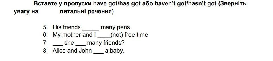 Вставте у пропуски have got/has got або haven't got/hasn't got (Зверніть увагу на питальні речення) 5. 6. 7. 8. Alice and John His friends My mother and I she many pens. (not) free time many friends? a baby.