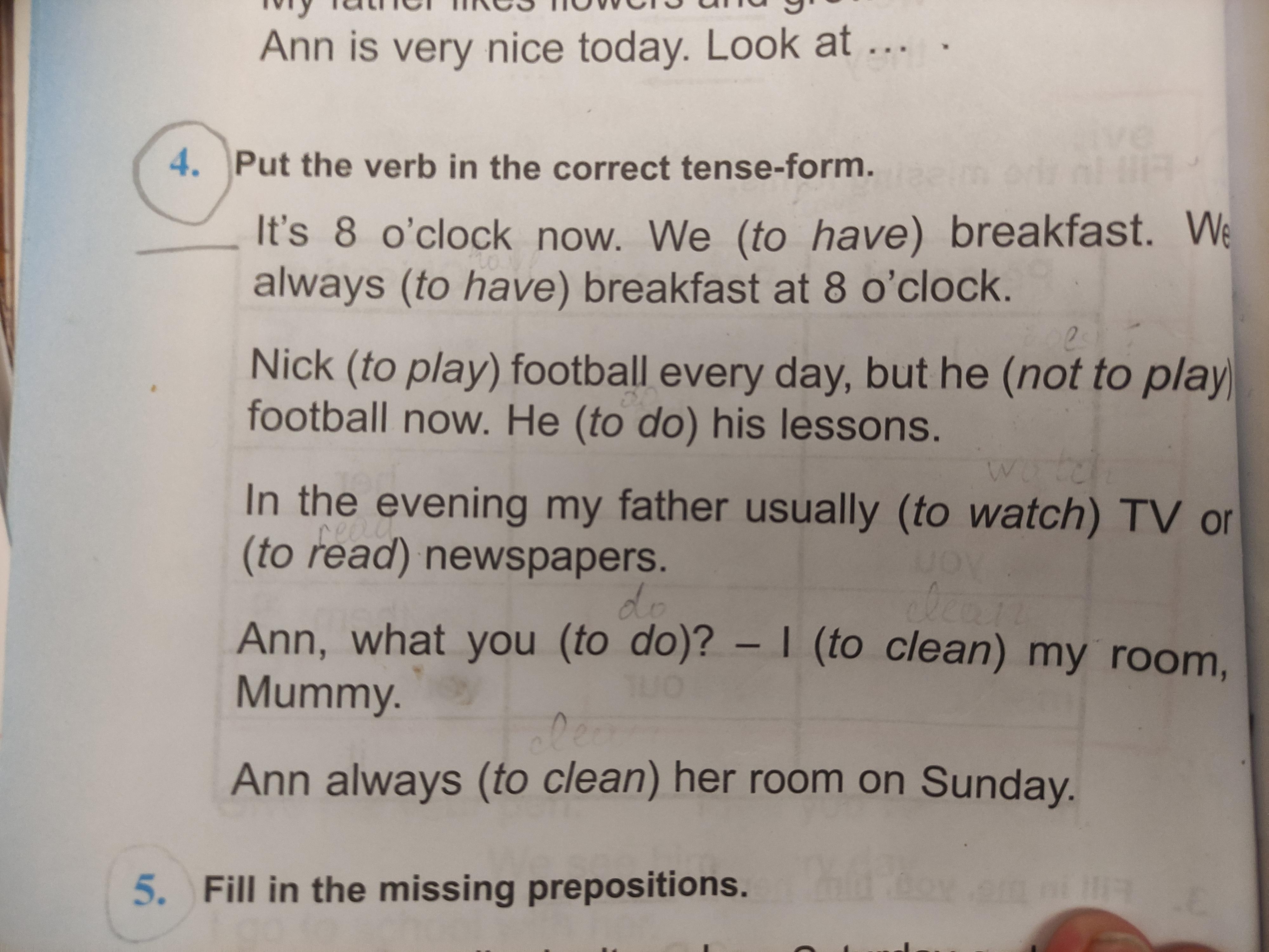 It's 8 o'clock now. We are having breakfast. We always have breakfast at 8 o'clock. Nick plays football every day, but he is not playing football now. He is doing his lessons. In the evening, my father usually watches TV or reads newspapers.