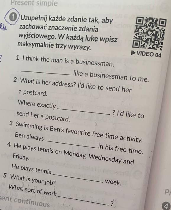 Present simple h 1 Uzupełnij każde zdanie tak, aby zachować znaczenie zdania wyjściowego. W każdą lukę wpisz maksymalnie trzy wyrazy. 1 I think the man is a businessman. l 2 What is her address? I'd like to send her a postcard. VIDEO 04 like a businessman to me. Friday. He plays tennis 5 What is your job? Where exactly. send her a postcard. 3 Swimming is Ben's favourite free time activity. in his free time. Ben always. 4 He plays tennis on Monday, Wednesday and What sort of work. Present continuous _? I'd like to week.
