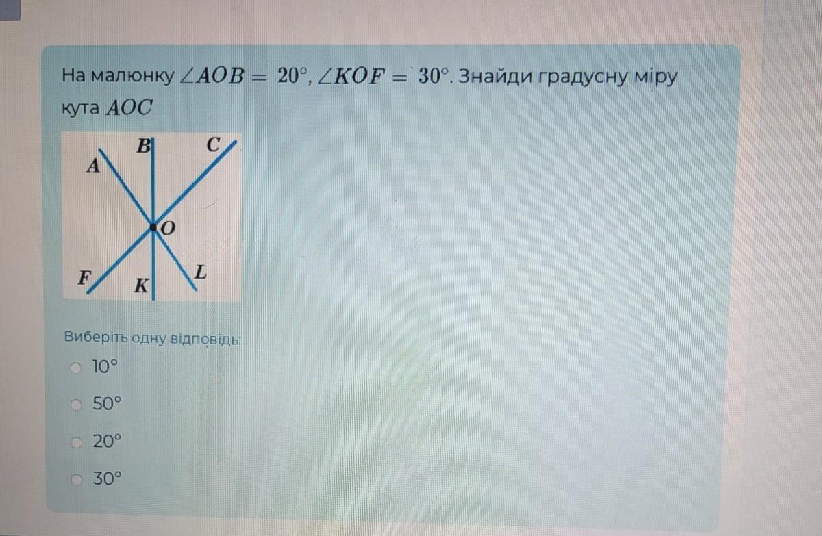 Тому ∠AOC = 20° + 30° = 50° ; ∠AOC = 50° .