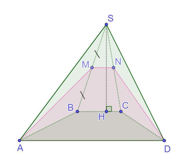 Основою піраміди ЅABCD є трапеція ABCD (BC||AD). Бічна грань SBC, площа якої дорівнює 24,4 см², перпендикулярна до площини основи піраміди. Точка М - середина ребра SB. Площина (MAD) перетинає ребро SC в точці N. Визначте довжину відрізка MN (у см), якщо об'єм піраміди дорівнює 152 см³, а площа її основи - 57 см².