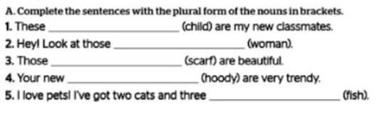 A. Complete the sentences with the plural form of the nouns in brackets. 1. These (child) are my new classmates. 2. Heyl Look at those (woman). 3. Those (scarf) are beautiful. (hoody) are very trendy. 4. Your new 5. I love pets! I've got two cats and three (fish).