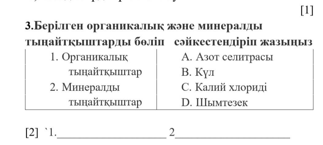 3.Берілген органикалық және минералды тыңайтқыштарды бөліп сәйкестендіріп жазыңыз А. Азот селитрасы 1. Органикалық тыңайтқыштар 2. Минералды [2] `1. тыңайтқыштар 2 В. Күл С. Калий хлориді D. Шымтезек