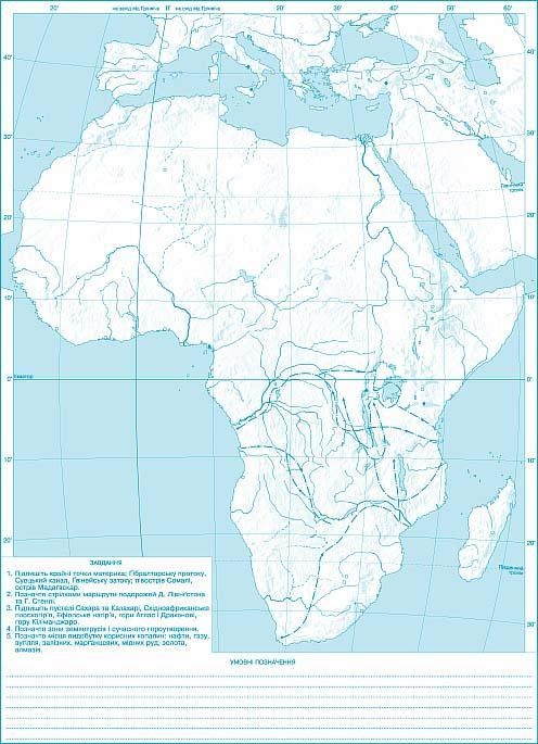 Позначте на контурній карті назви основних географічних об’єктів Африки