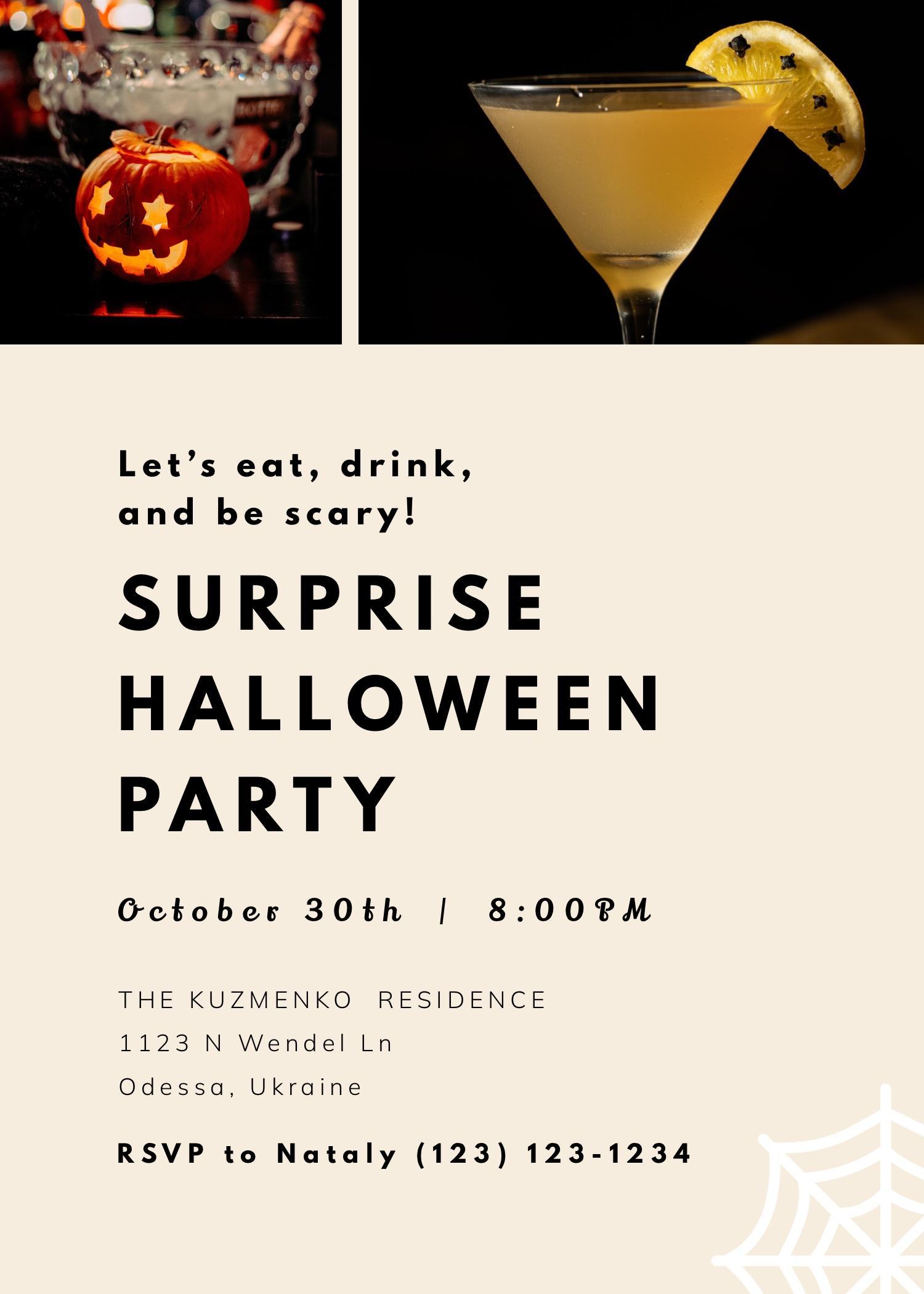 какую еду и напитки вы хотите — Торт-призрак, крендельки-скелеты, шарики из попкорна, кексы-пауки, пицца, кока-кола, картофель фри, без алкогольные коктейли, мартини «Черная вдова».
