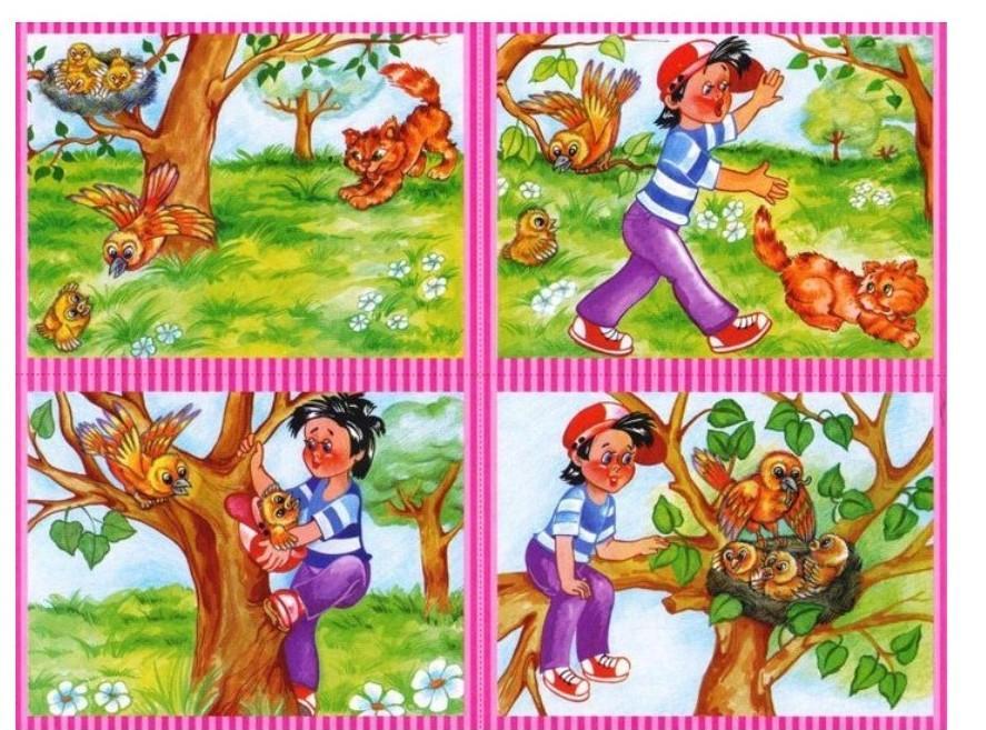 На данной картинке можно увидеть как кошка хочет съесть птица которая упала с гнезда а мама птица не успевает его спасти но мальчик успевает его спасти и отогнать кошку а после возвращает птенца на место