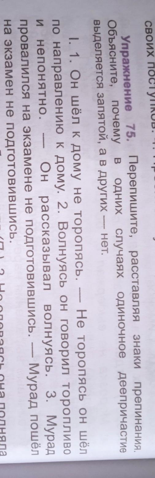 Упражнение 75. Перепишите, расставляя знаки препинания. одних случаях одиночное деепричастие обьяснението е, почему выделяется запятой, а в других нет. 1. 1. Он шёл к дому не торопясь. Не торопясь он шёл по направлению к дому. 2. Волнуясь он говорил торопливо И непонятно. волнуясь. 3. Мурад Он рассказывал провалился на экзамене не подгОТОВИВШИСь. на экзамен не подготовившись. Мурад пошёл