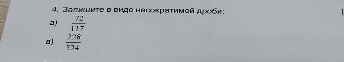 4. Запишите в виде несократимой дроби: 72/117, 228/524 даю 10 баллов!