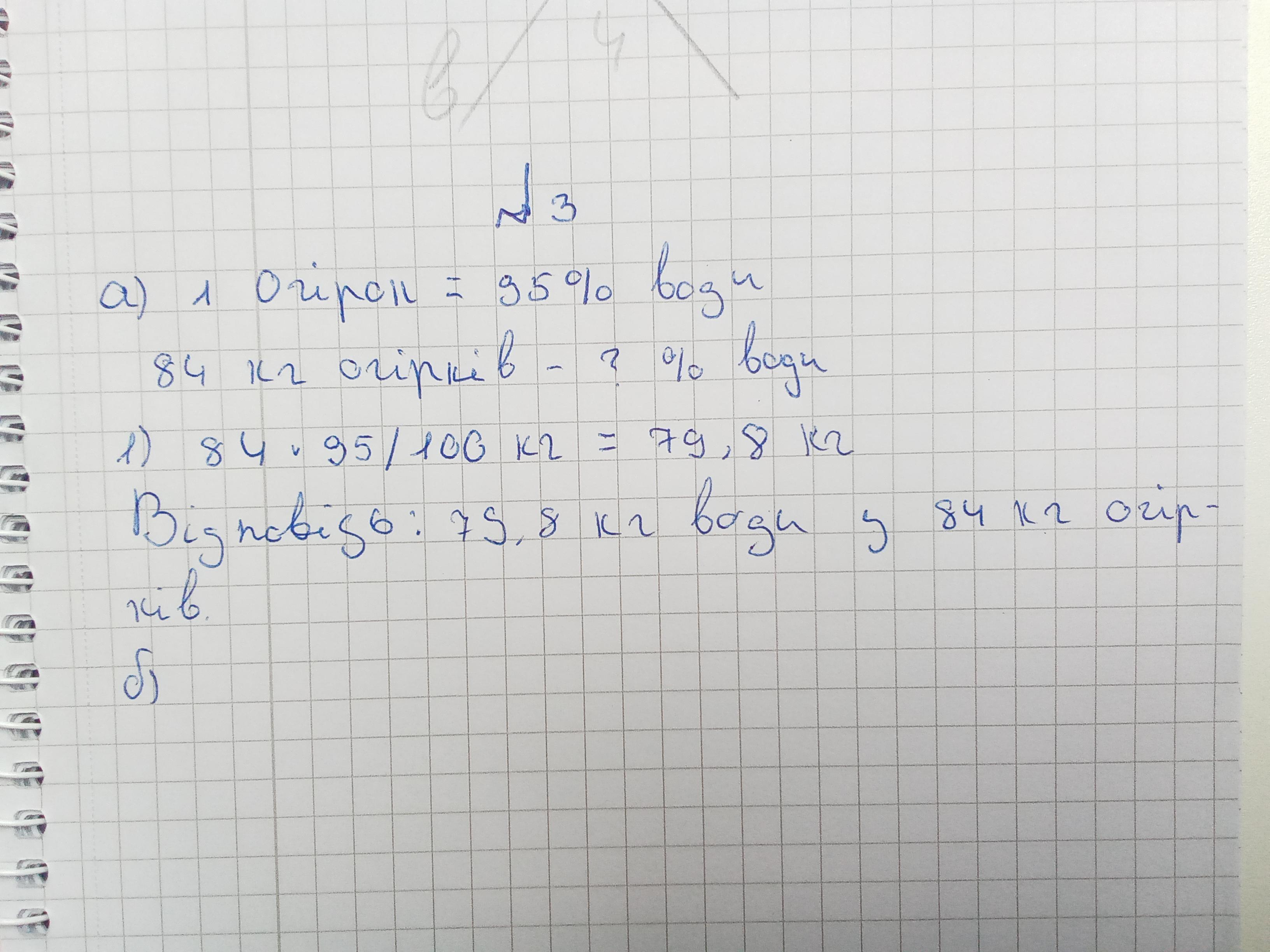 3. Розв’яжи задачу. а) Огірки містять приблизно 95 % води. Скільки кілограмів води у 84 кг огірків? б) Поїзд проїхав 200 км. За першу годину він подолав 48 % цієї відстані, а потім зупинився. Коли поїзд проїхав більшу відстань: до зупинки чи після? На скільки?