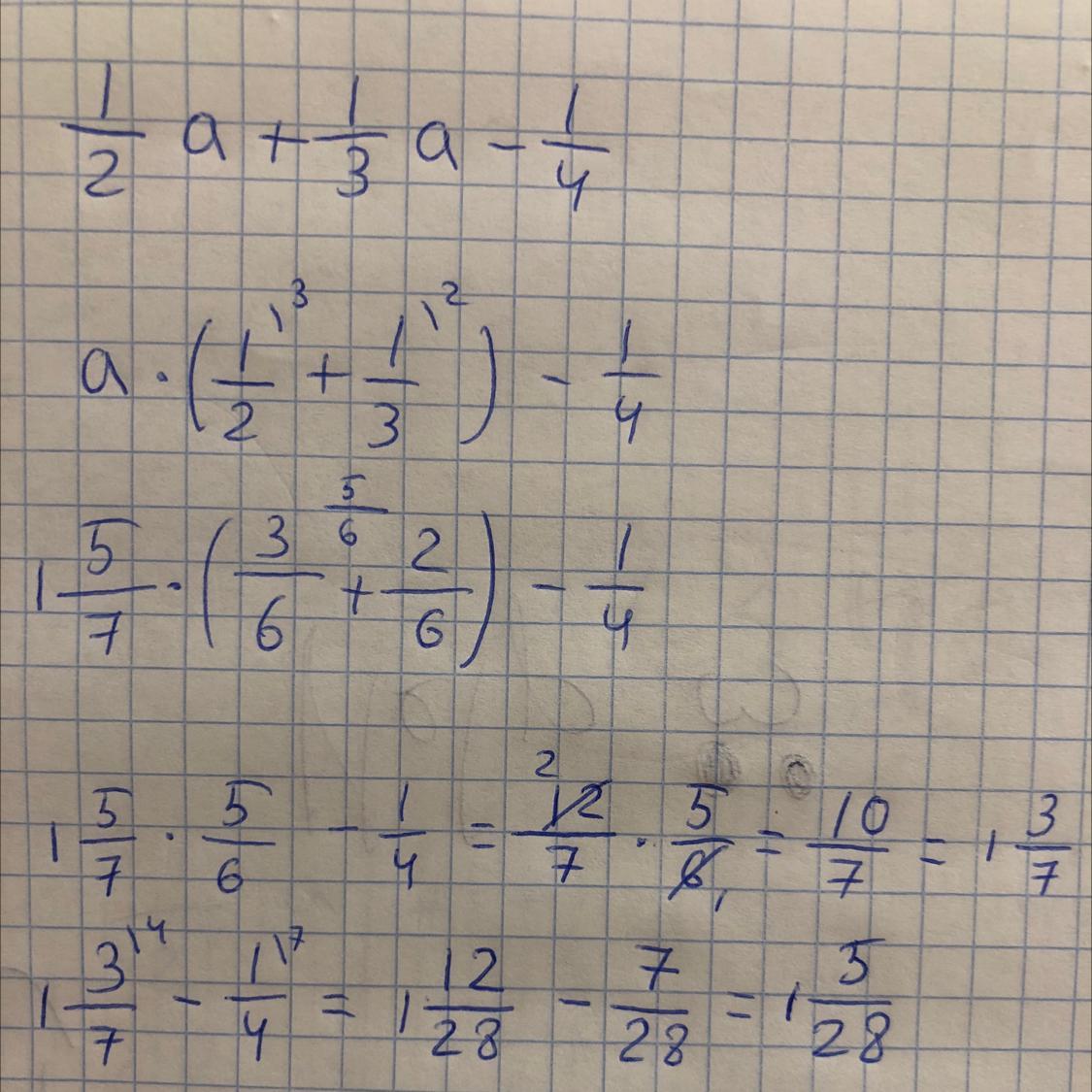 1/2 • 1 5/7 + 1/3 • 1 5/7 - 1/4 • 1 5/7 = 1/2 • 12/7 + 1/3 • 12/7 - 1/4 • 12/7 = 6/7 + 4/7 - 3/7 = 1