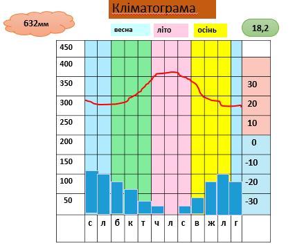 Опади: літо сухе, зима волога. До 622мм опадів за рік.