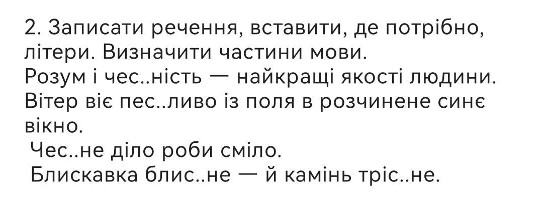 Розум і чесність (іменник) - найкращі якості людини. Вітер віє пестливо (прикметник) із поля в розчинене синє вікно. Чесне (прикметник) діло роби сміло. Блискавка блисне (дієслово) - й камінь трісне (дієслово).