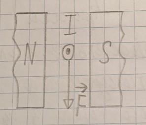 Визначте полюси магніту за напрямком сили Ампера та напрямком струму в провіднику (див. рис.).