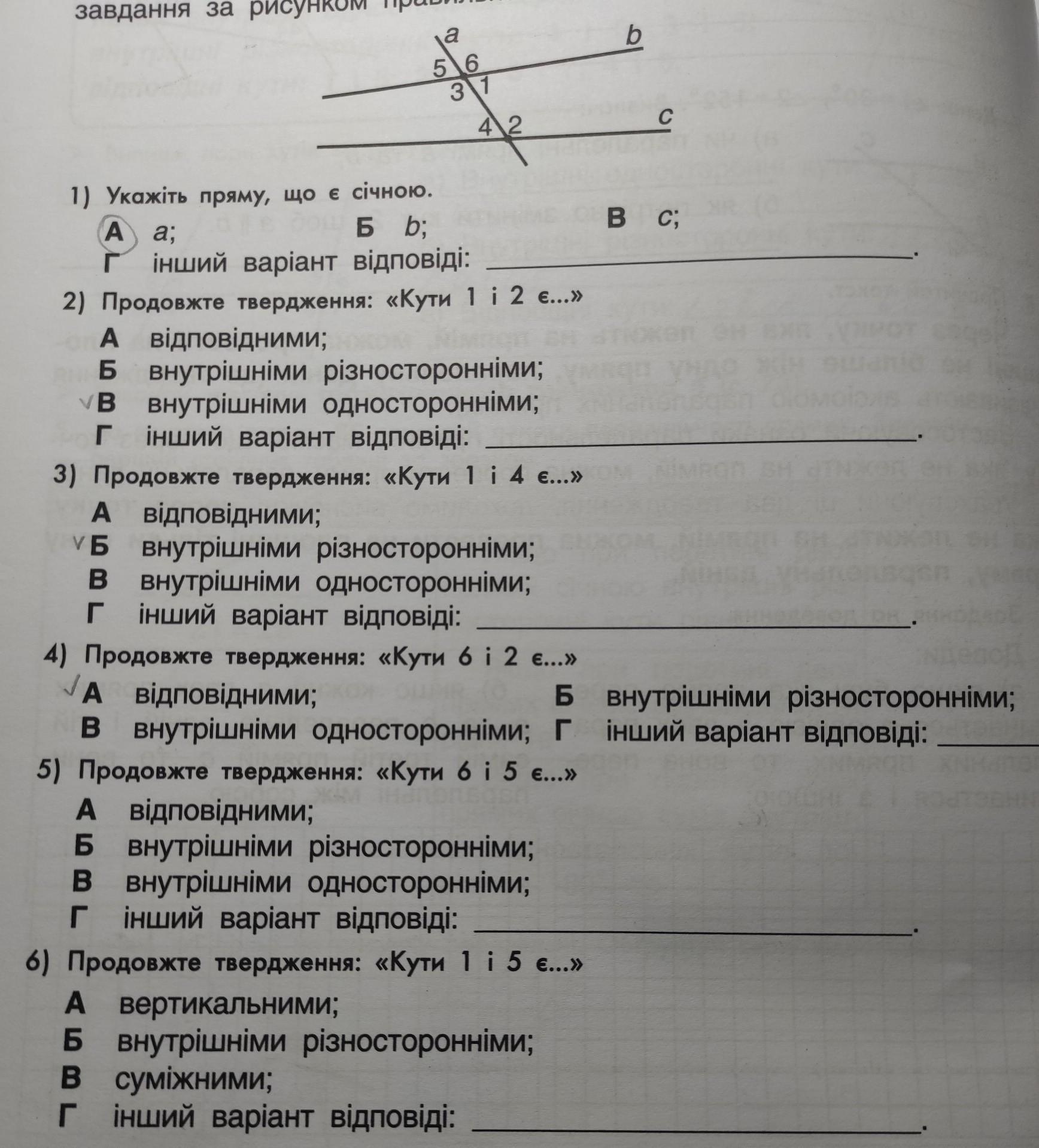 a 5 6 3 1 42 1) Укажіть пряму, що є січною. ШБ b; A a; Г інший варіант відповіді: 2) Продовжте твердження: «Кути 1 і 2 є...» А відповідними; Б ВНУТрішніми рiзносторонніми; В внутрішніми односторонніми; Г інший варіант відповіді: 3) Продовжте твердження: «Кути 1 і 4 є...» А відповідними; V Б ВНУТРiшнiми різносторонніми; В внутрішніми односторонніми; Г інший варіант відповіді: 4) Продовжте твердження: «Кути 6 і 2 є...» відповідними; A Б В внутрішніми односторонніми; Г 5) Продовжте твердження: «Кути 6 і 5 є...» A відповідними; Б внутрішніми різносторонніми; в внутрішніми односторонніми; Г інший варіант відповіді: 6) Продовжте твердження: «Кути 1 і 5 €...» А вертикальними; Б внутрішніми різносторонніми; в суміжними; Г інший варіант відповіді: b с вс; ВНУТрішніми різносторонніми; інший варіант відповіді:ДОПОМОЖІТЬ БУДЬ ЛАСКА!!!!