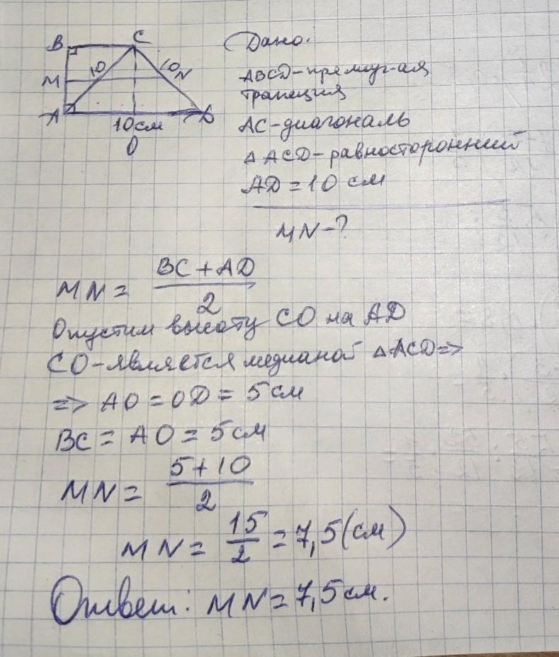 Діагональ прямокутної трапеції відтинає рівносторонній трикутник. Знайти середню лінію трапеції, якщо її більша основа 10 см.