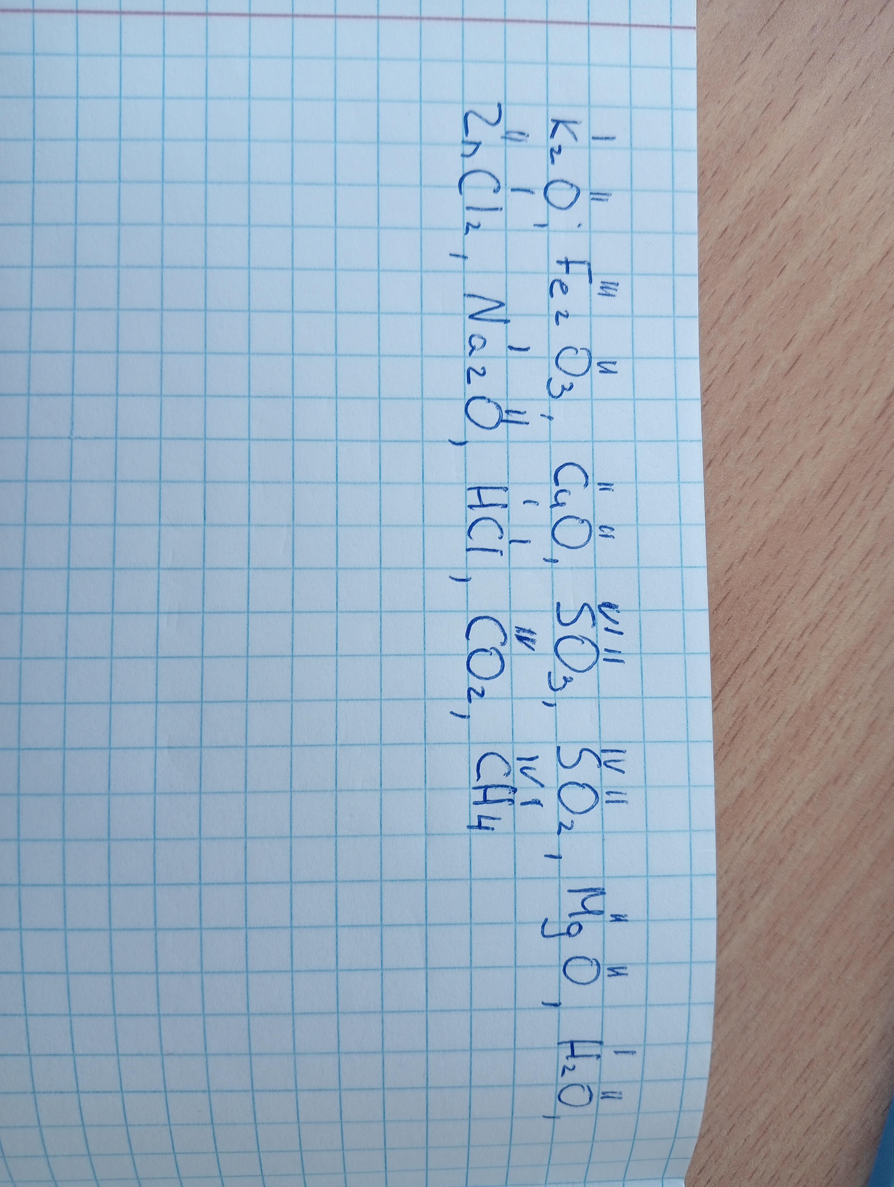 Визначити валентність елементів у формулах K2O, Fe2O3, CuO, SO3, SO2, MgO, H2O, ZnCl2, Na2O, HCI, NH3, CO2, CH4