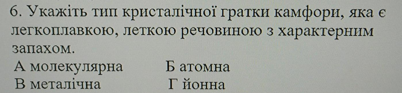 Тип кристалічної гратки камфори - молекулярна. Камфора складається з молекул камфори, які утворюють молекулярну гратку. Камфора є летючою речовиною з характерним запахом і може піддається сублімації (переходить з твердого в газоподібний стан без проміжного рідкого стану) при незначних температурах, що робить її легкоплавкою.