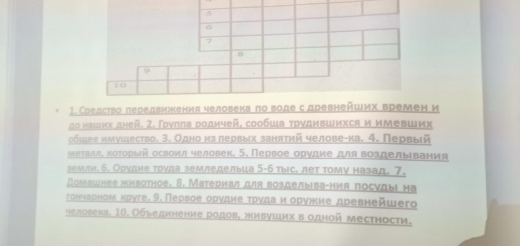 Решение крос 34567 • 1. Средство передвижения человека по воде с древнейших времен и до наших дней. 2. Группа родичей, сообща трудившихся и имевших общее имущество. 3. Одно из первых занятий челове-ка. 4. Первый металл, который освоил человек. 5. Первое орудие для возделывания земли. б. Орудие труда земледельца 5-6 тыс. лет тому назад. 7. Домашнее животное. 8. Материал для возделыва-ния посуды на гончарном круге. 9. Первое орудие труда и оружие древнейшего человека. 10. Объединение родов, живущих в одной местности. про