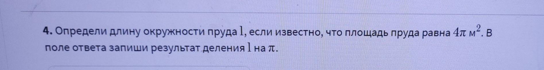 4. Определи длину окружности пруда l, если известно, что площадь пруда равна 4 πм². В поле ответа запиши результат деления l на π.